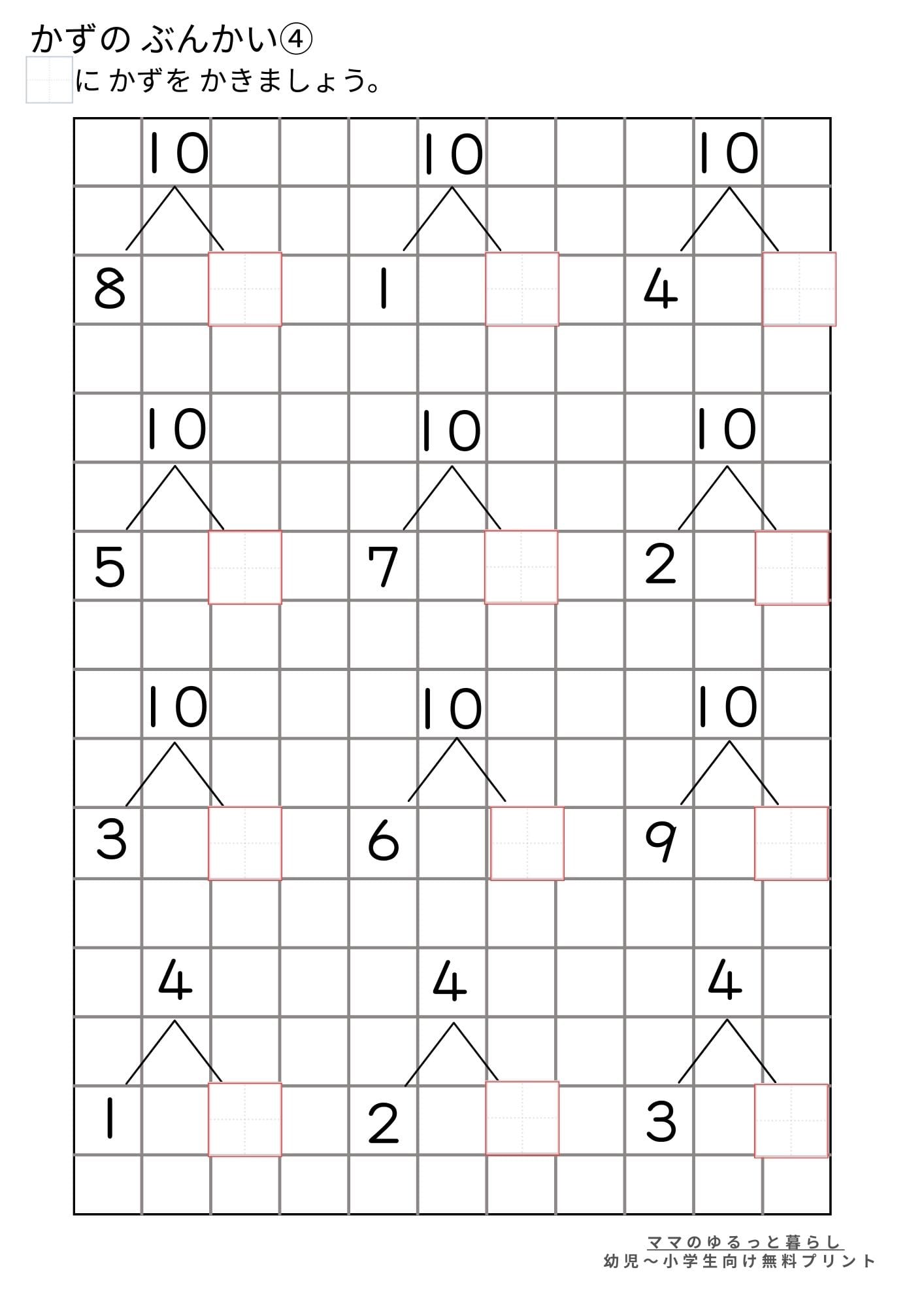 10になるペア(いくつといくつ)を覚えるためのプリントもおすすめです。